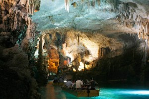 Lebanese journalists and photographers tour the lower cave of the Jeita Grotto by boat during a media day to campaign for the selection of the Jeitta Grotto as one of the seven natural wonders of the world
