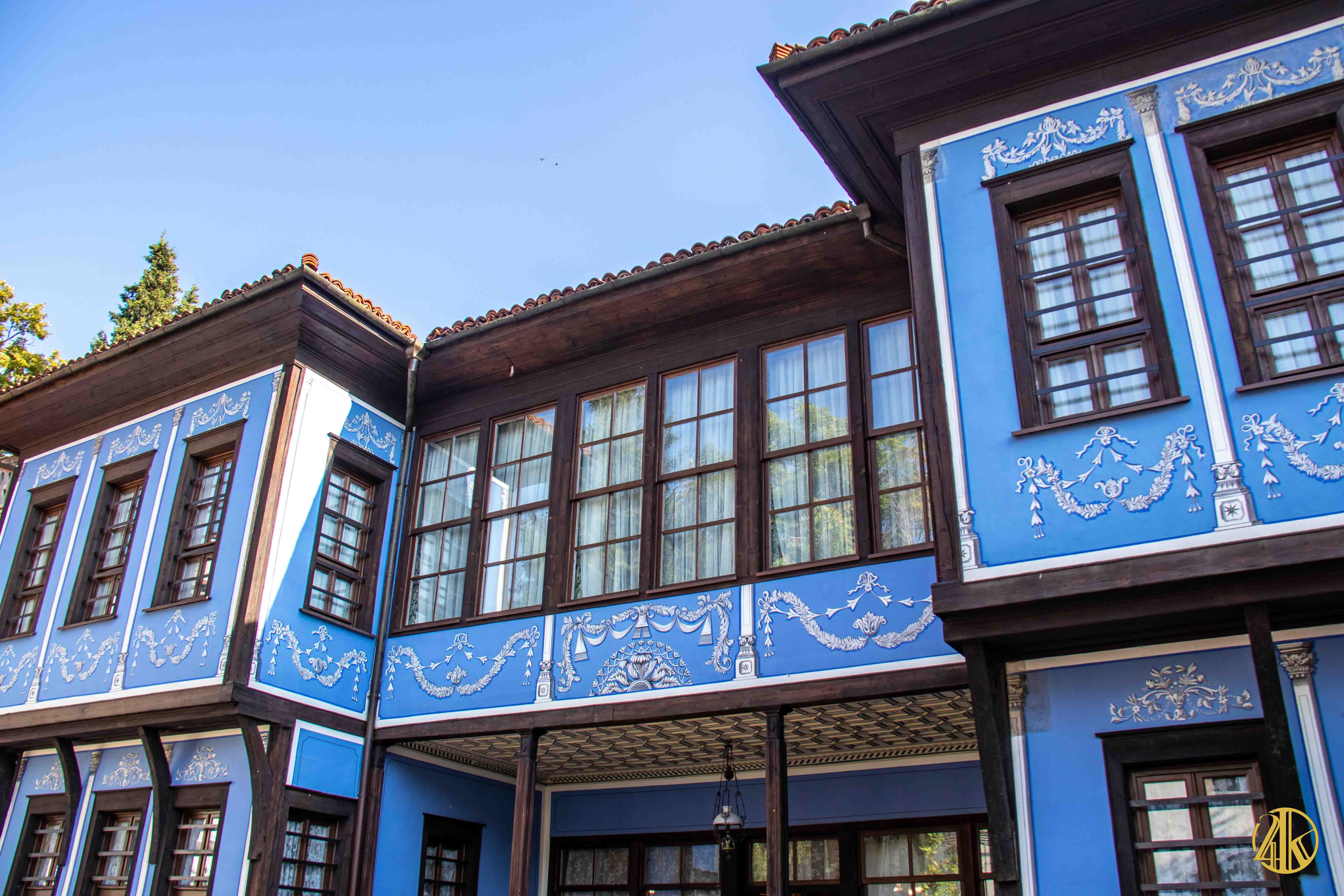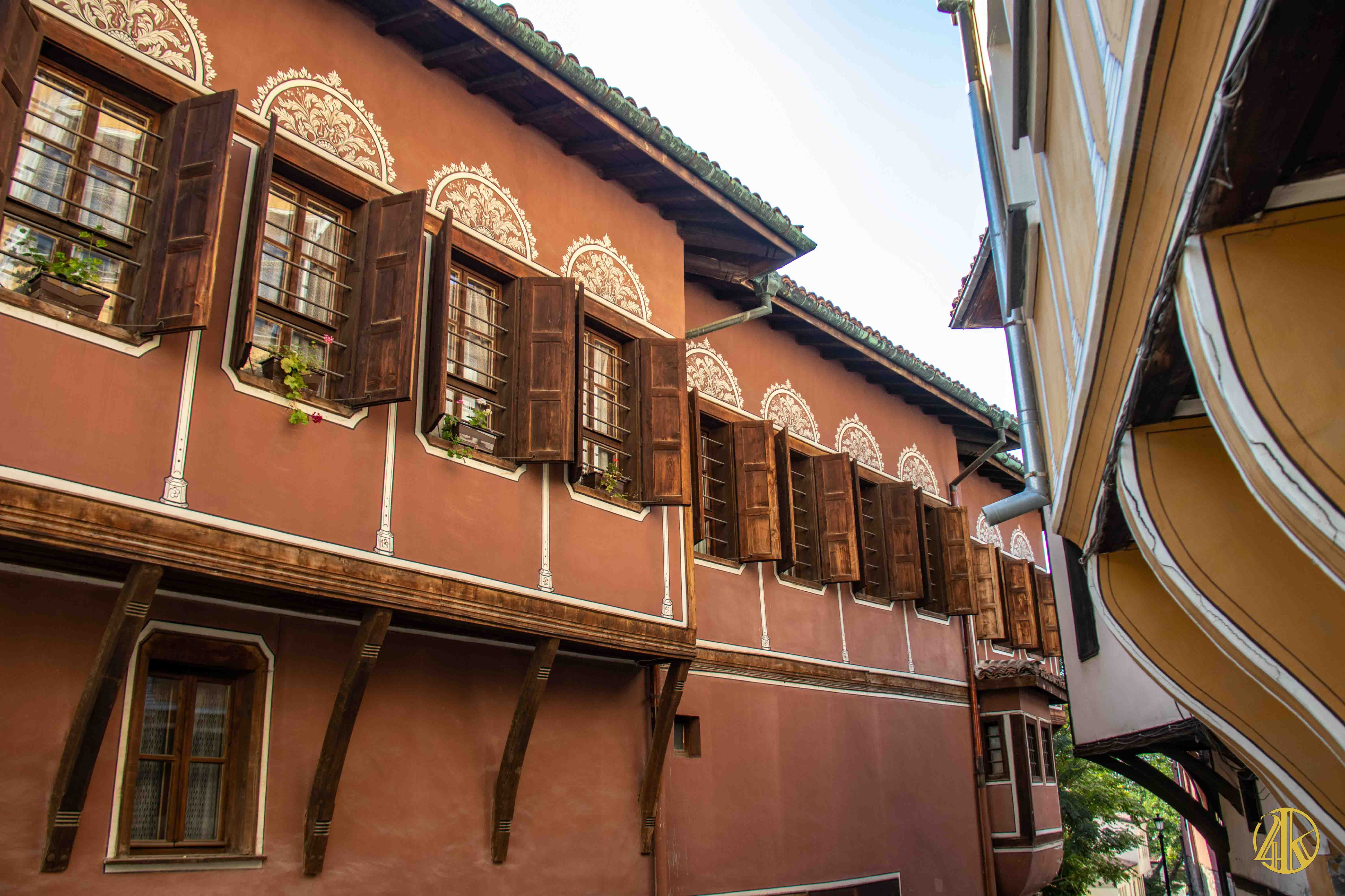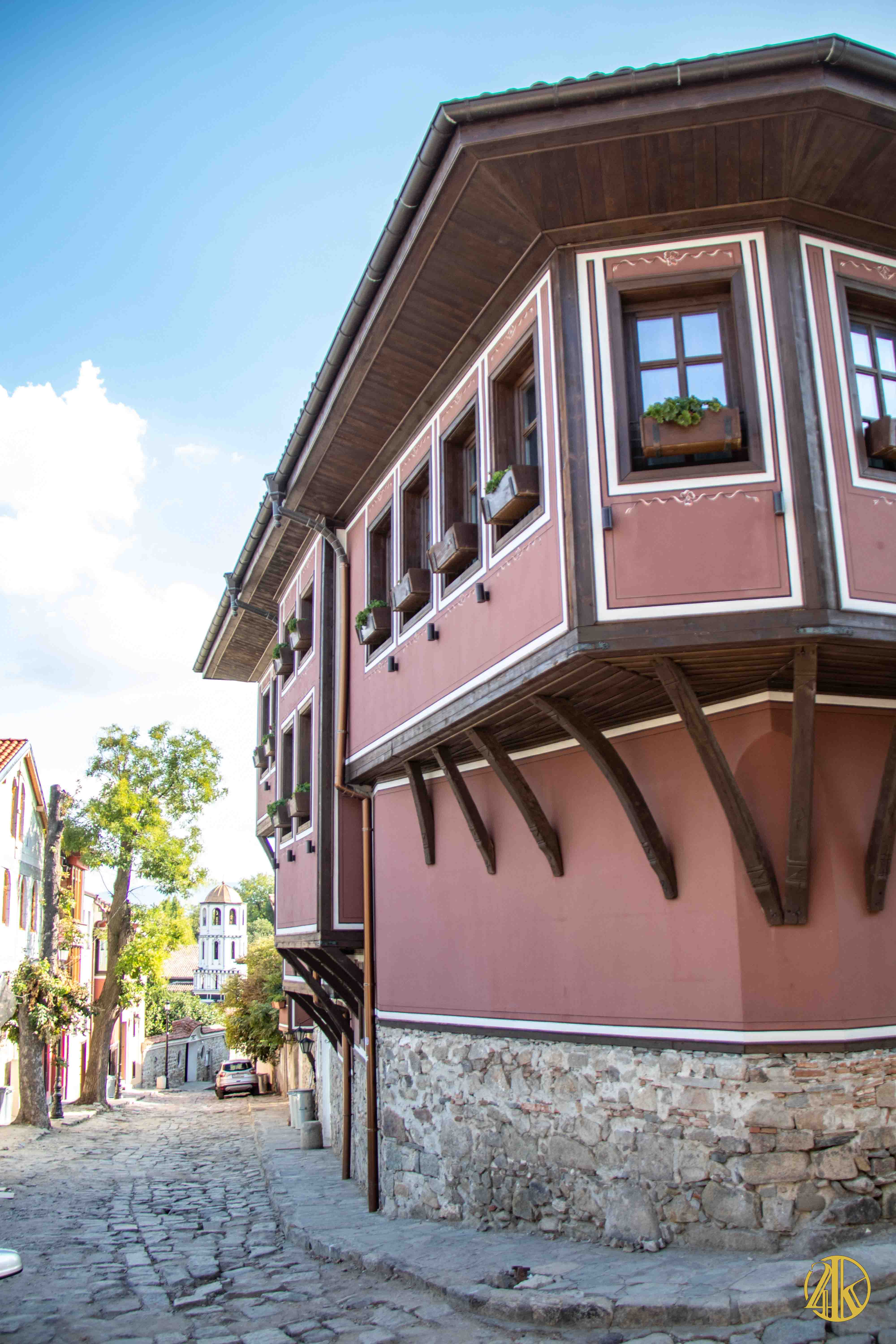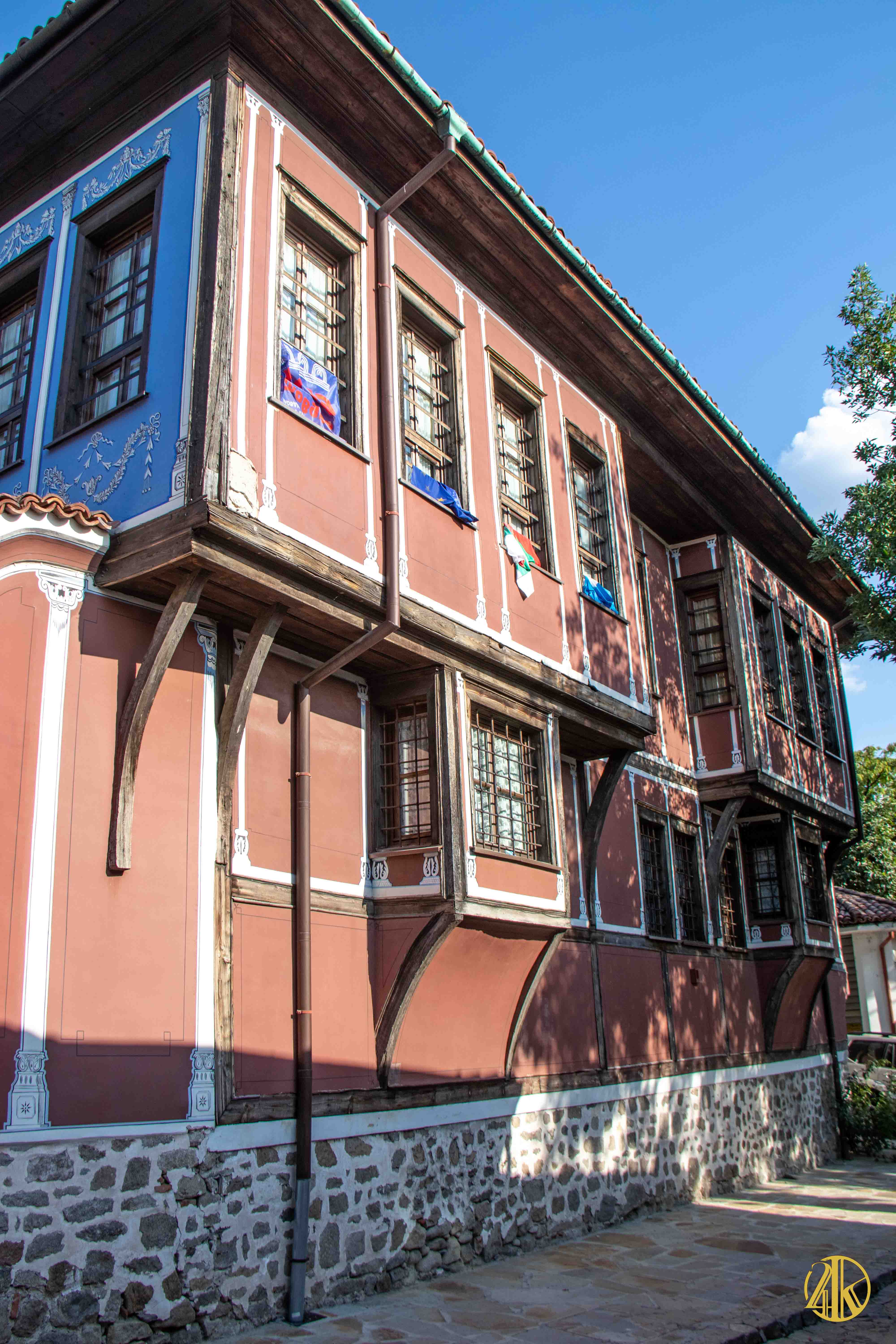 On s’enfonce tranquillement dans le vieux Plovdiv et on retrouve une concentration remarquable de bâtiments remontant au Renouveau bulgare (fin XVIIIème s.- début XIXème s.), période marquée par la volonté de s’émanciper de la domination ottomane et de développer le sentiment national bulgare. Les habitations présentent un style typiquement balkanique avec des stucs blancs, roses ou bleu vif, des charpente et boiseries sombres, des contreforts au courbes gracieuses et de fines colonnes, qui pour l’époque étaient assez avant-gardistes. C’est un vrai régal pour les yeux. Plusieurs maisons ont été transformées en musées et méritent la visite : Maison Kujumdzioglu, Maison Stepan Hindliyan, Maison Balabanova…