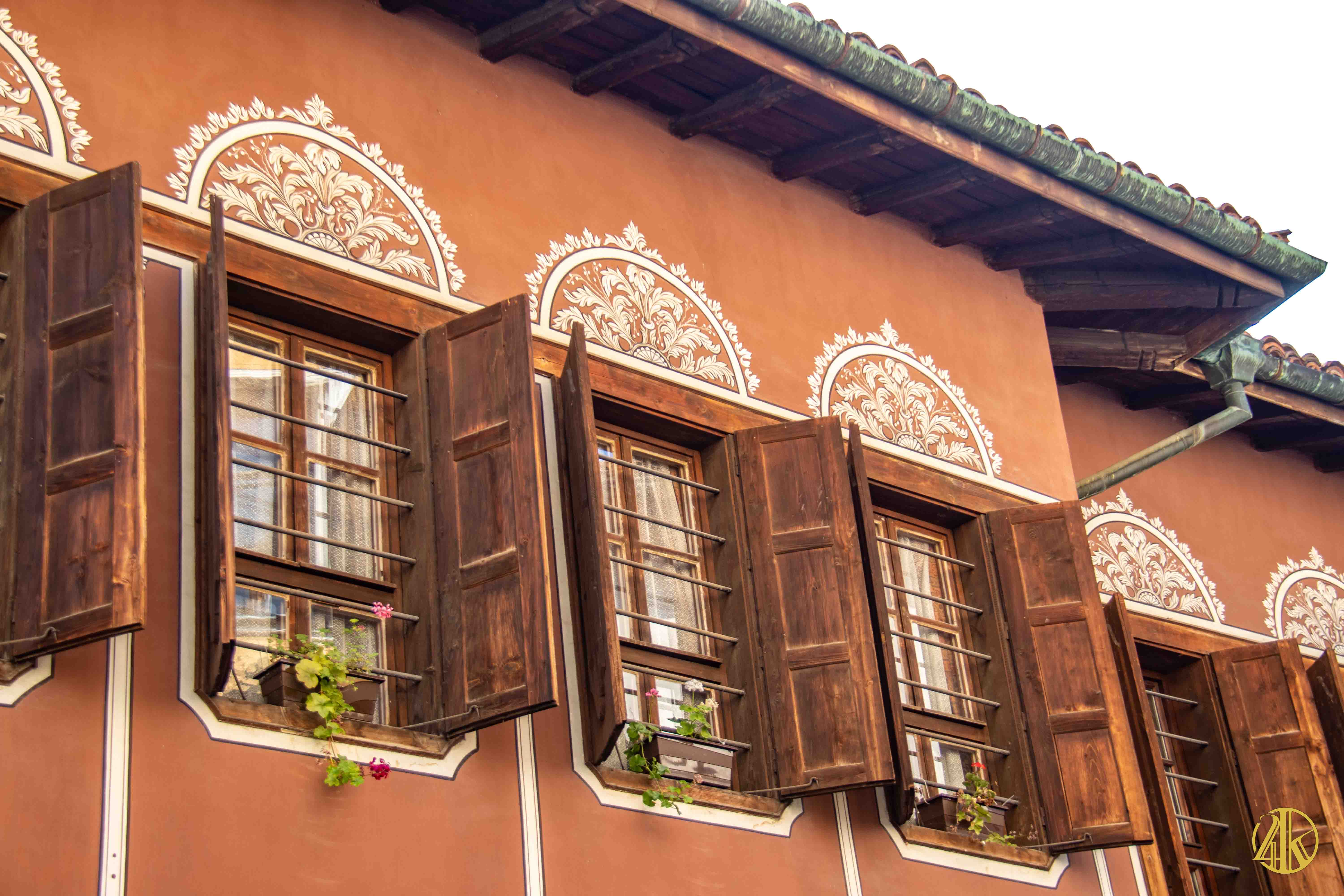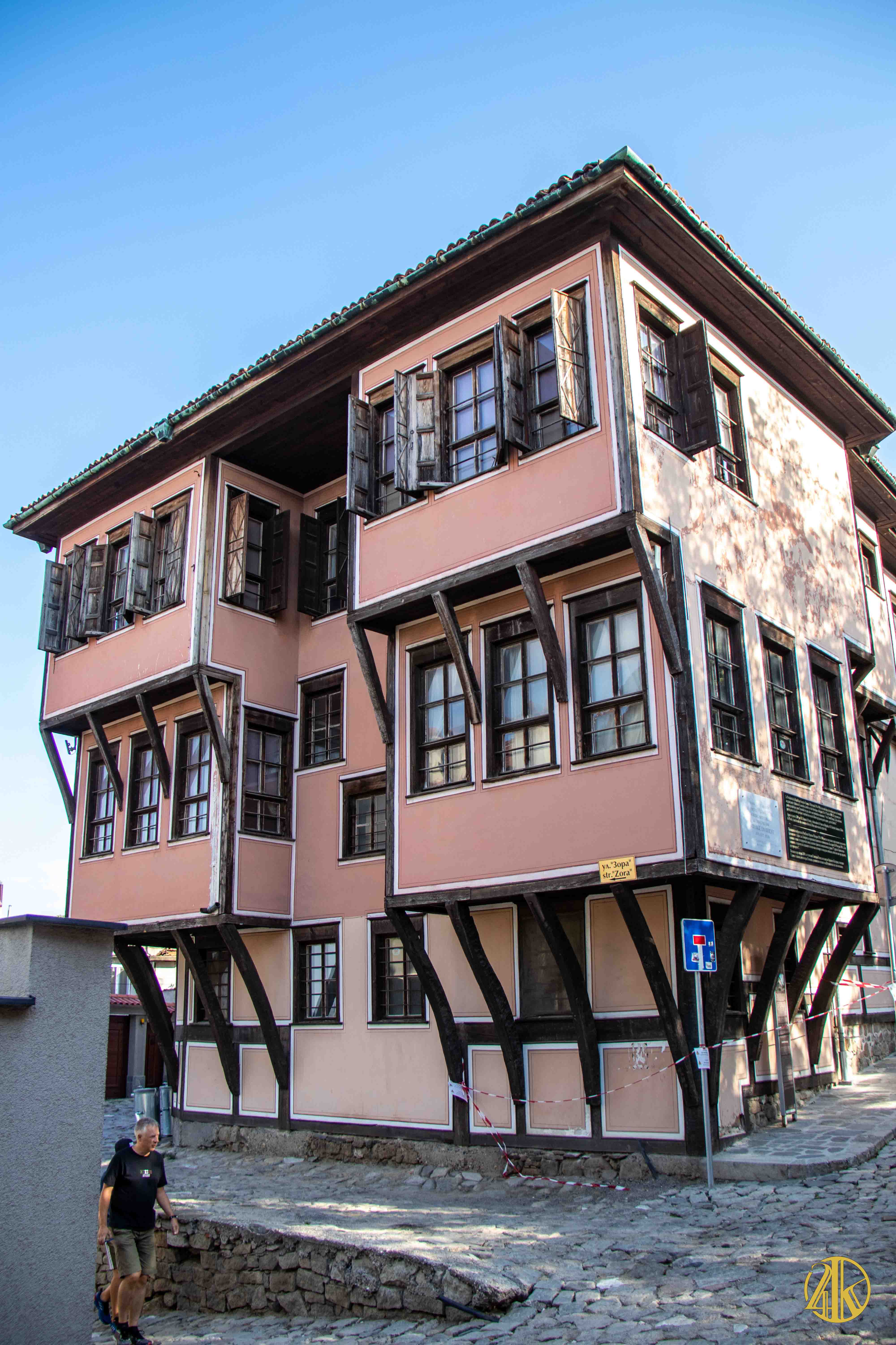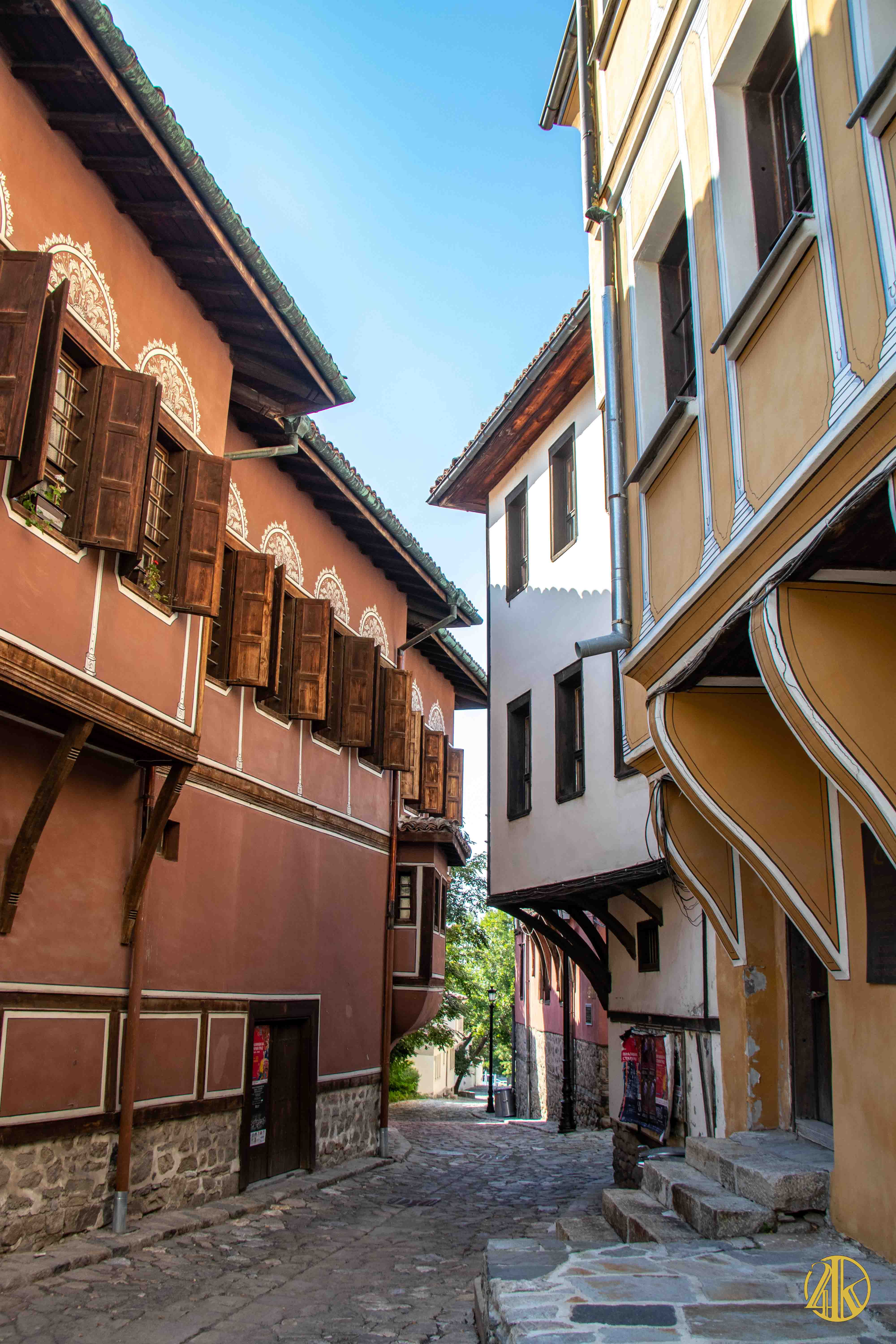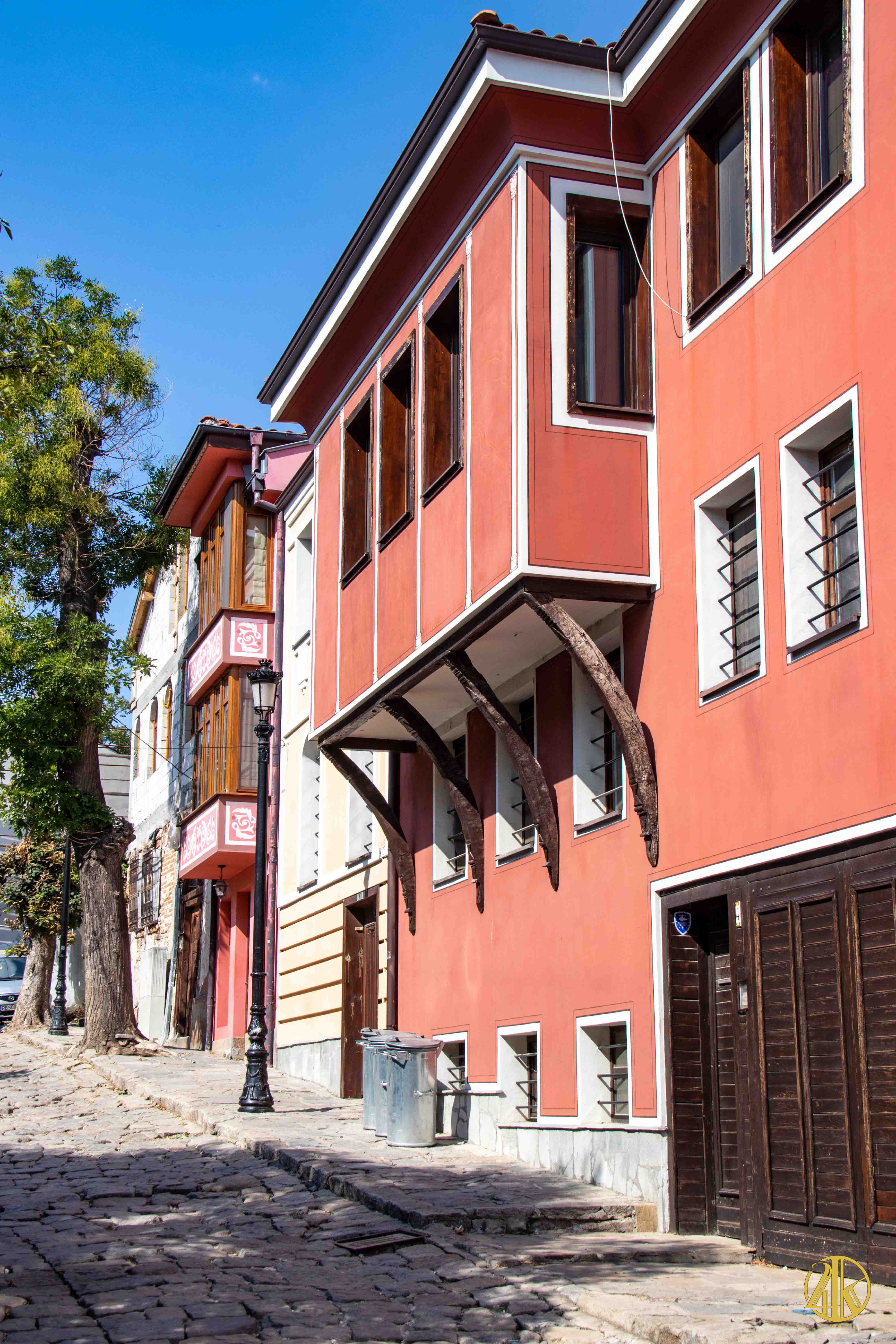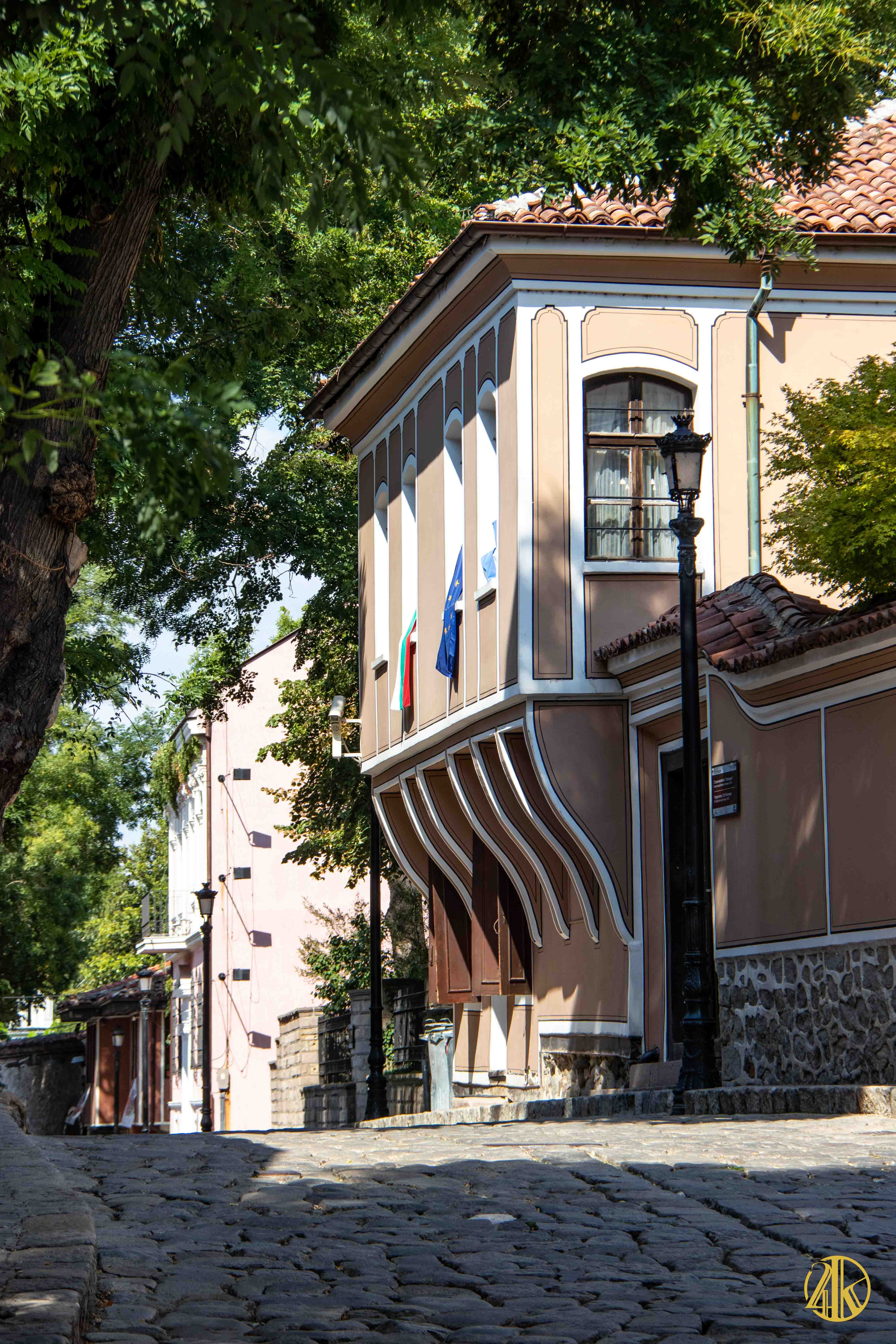 On s’enfonce tranquillement dans le vieux Plovdiv et on retrouve une concentration remarquable de bâtiments remontant au Renouveau bulgare (fin XVIIIème s.- début XIXème s.), période marquée par la volonté de s’émanciper de la domination ottomane et de développer le sentiment national bulgare. Les habitations présentent un style typiquement balkanique avec des stucs blancs, roses ou bleu vif, des charpente et boiseries sombres, des contreforts au courbes gracieuses et de fines colonnes, qui pour l’époque étaient assez avant-gardistes. C’est un vrai régal pour les yeux. Plusieurs maisons ont été transformées en musées et méritent la visite : Maison Kujumdzioglu, Maison Stepan Hindliyan, Maison Balabanova…